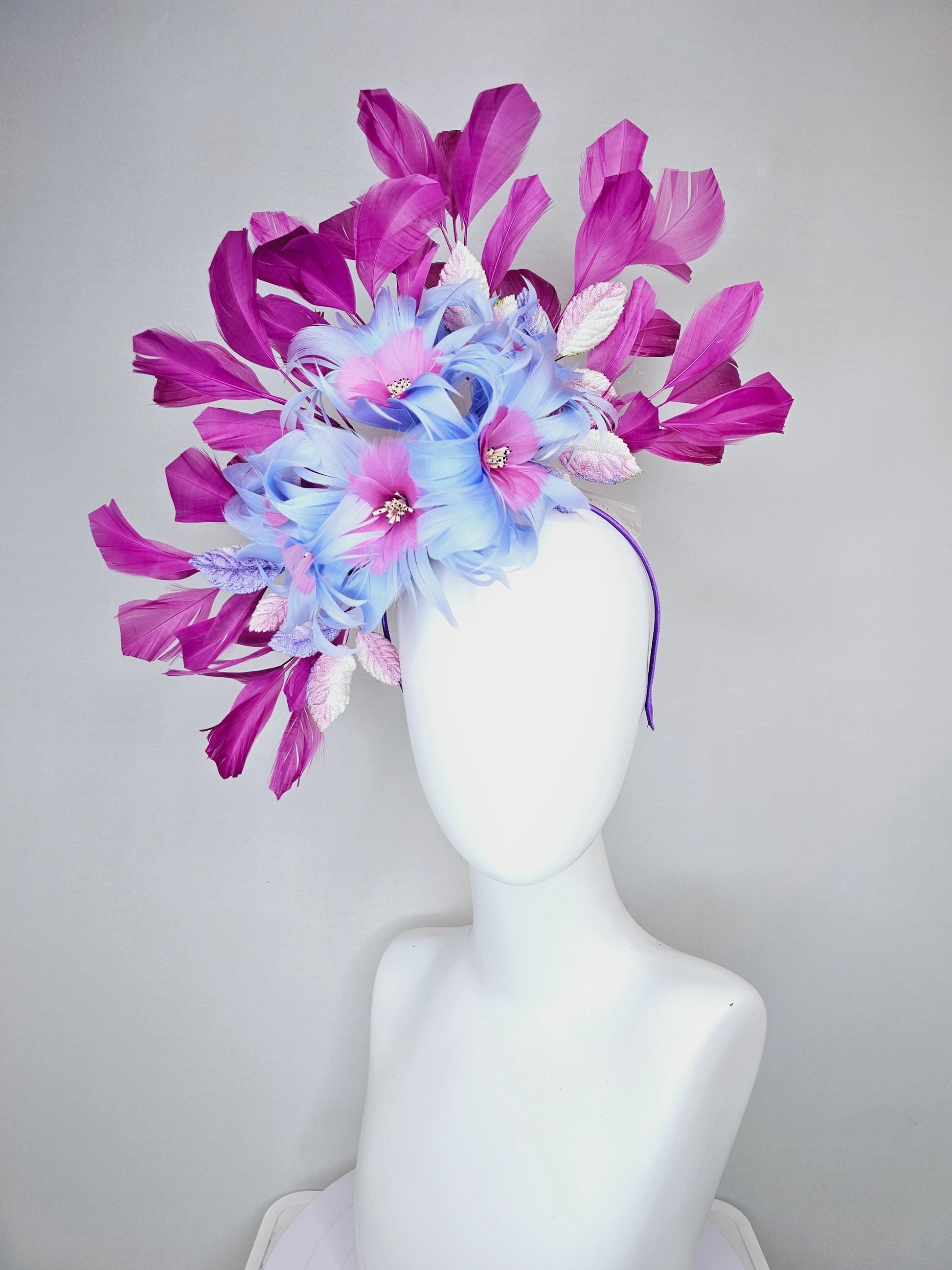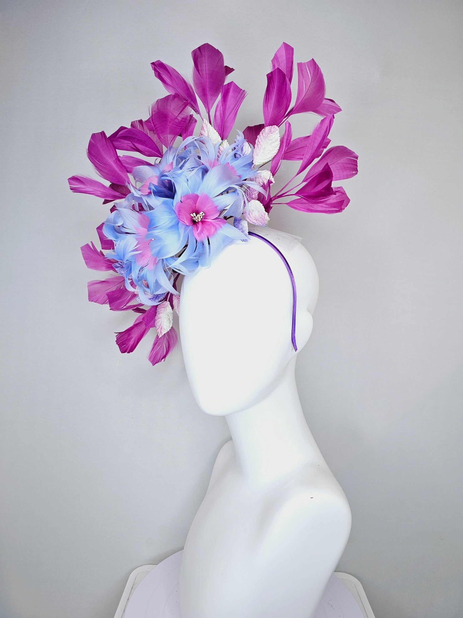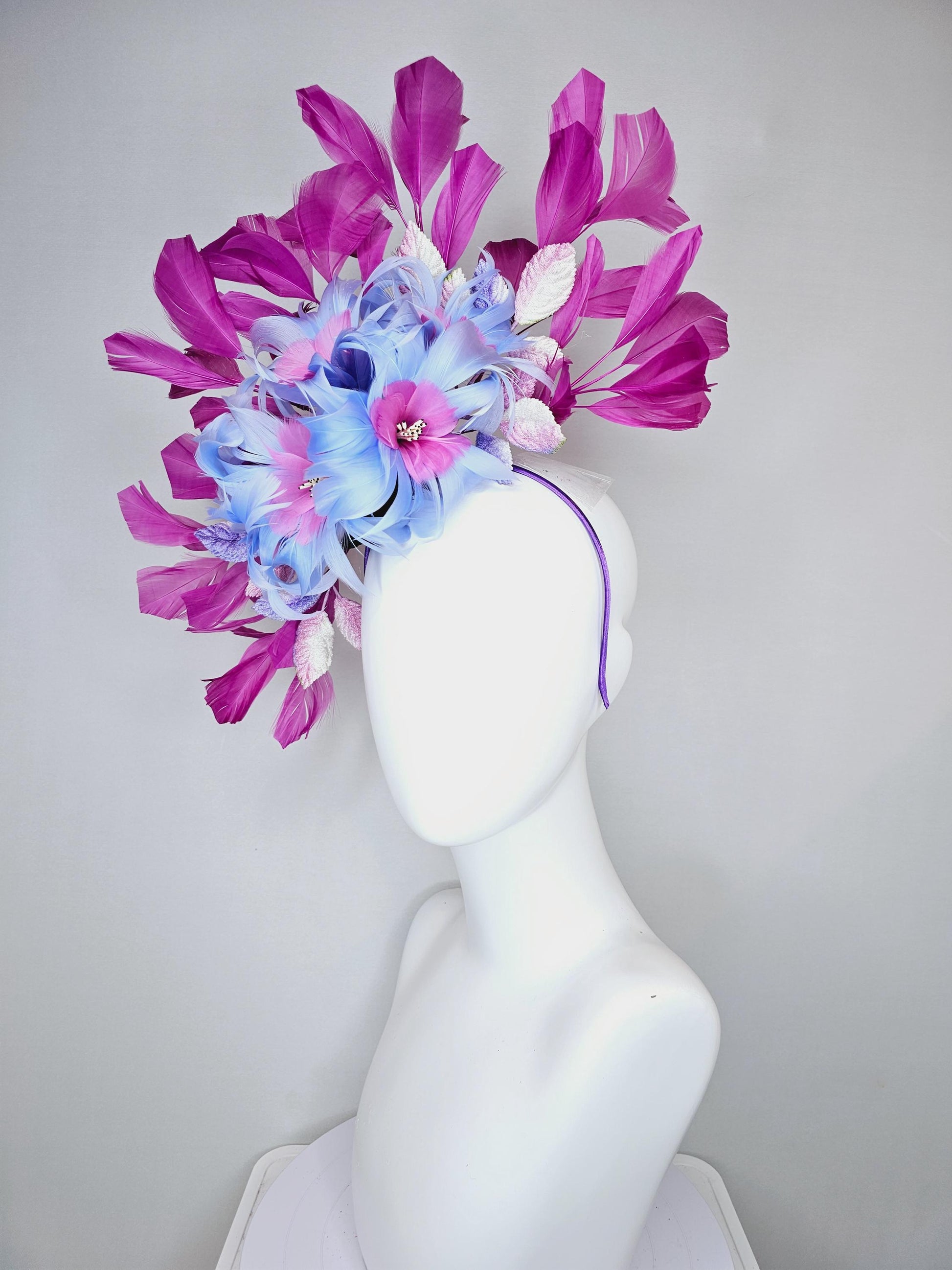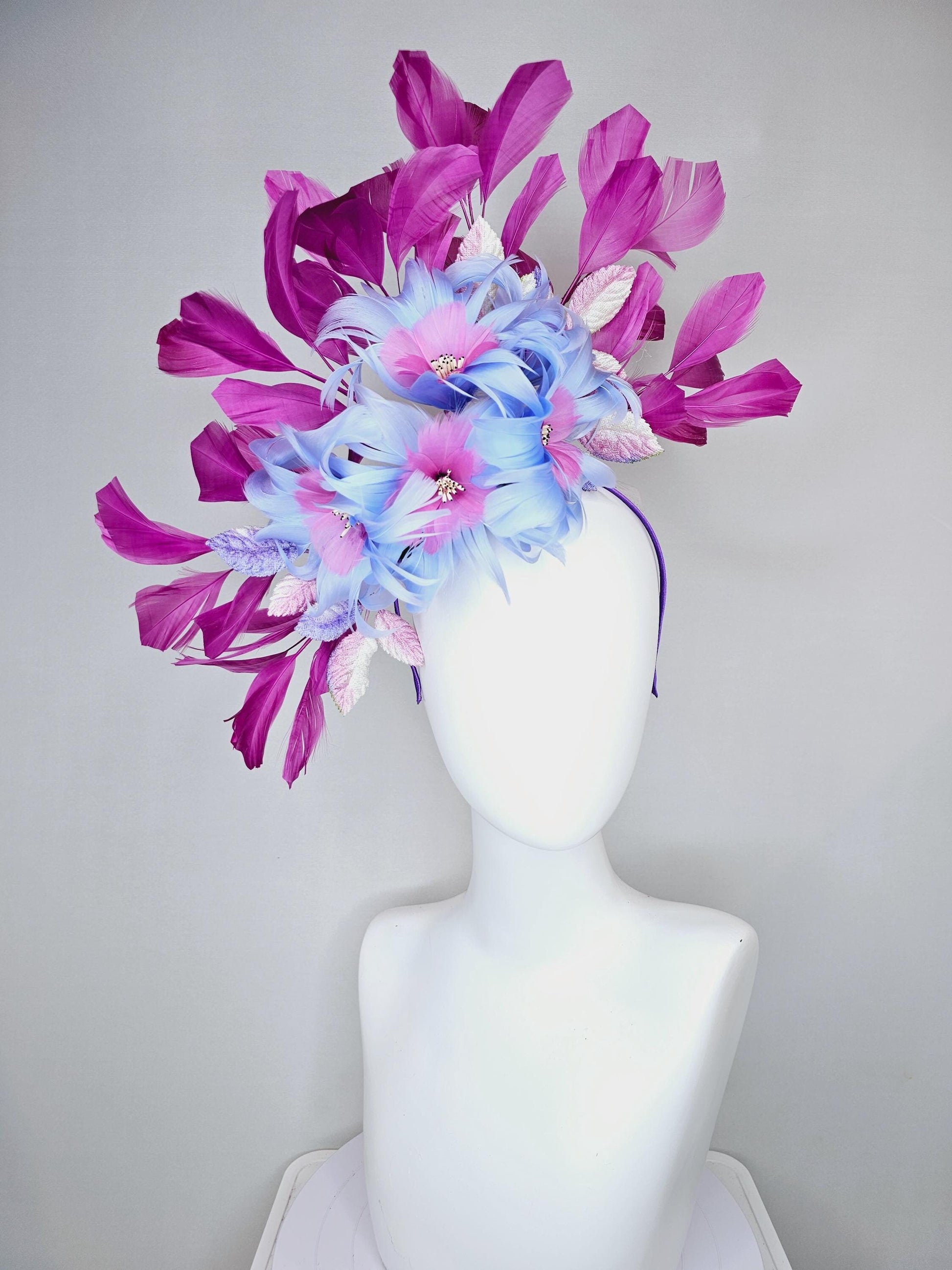 kentucky derby hat fascinator blue and pink feather flowers with ombre pink leaves and magenta purple branching feathers