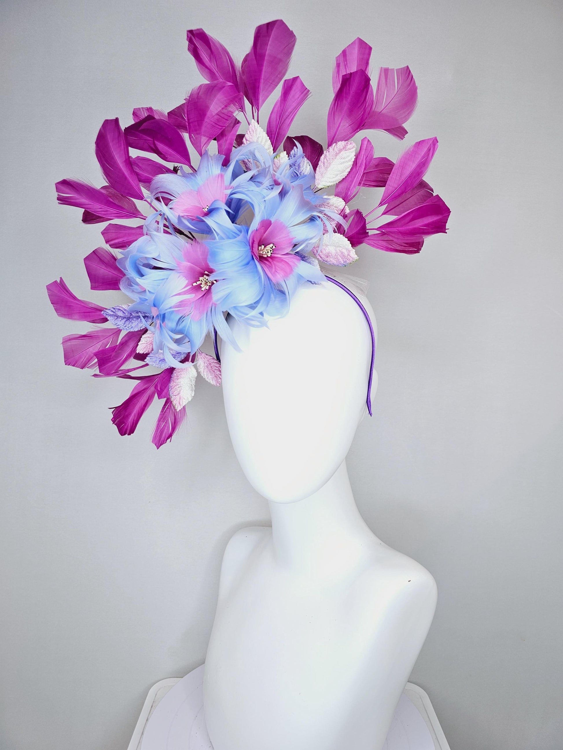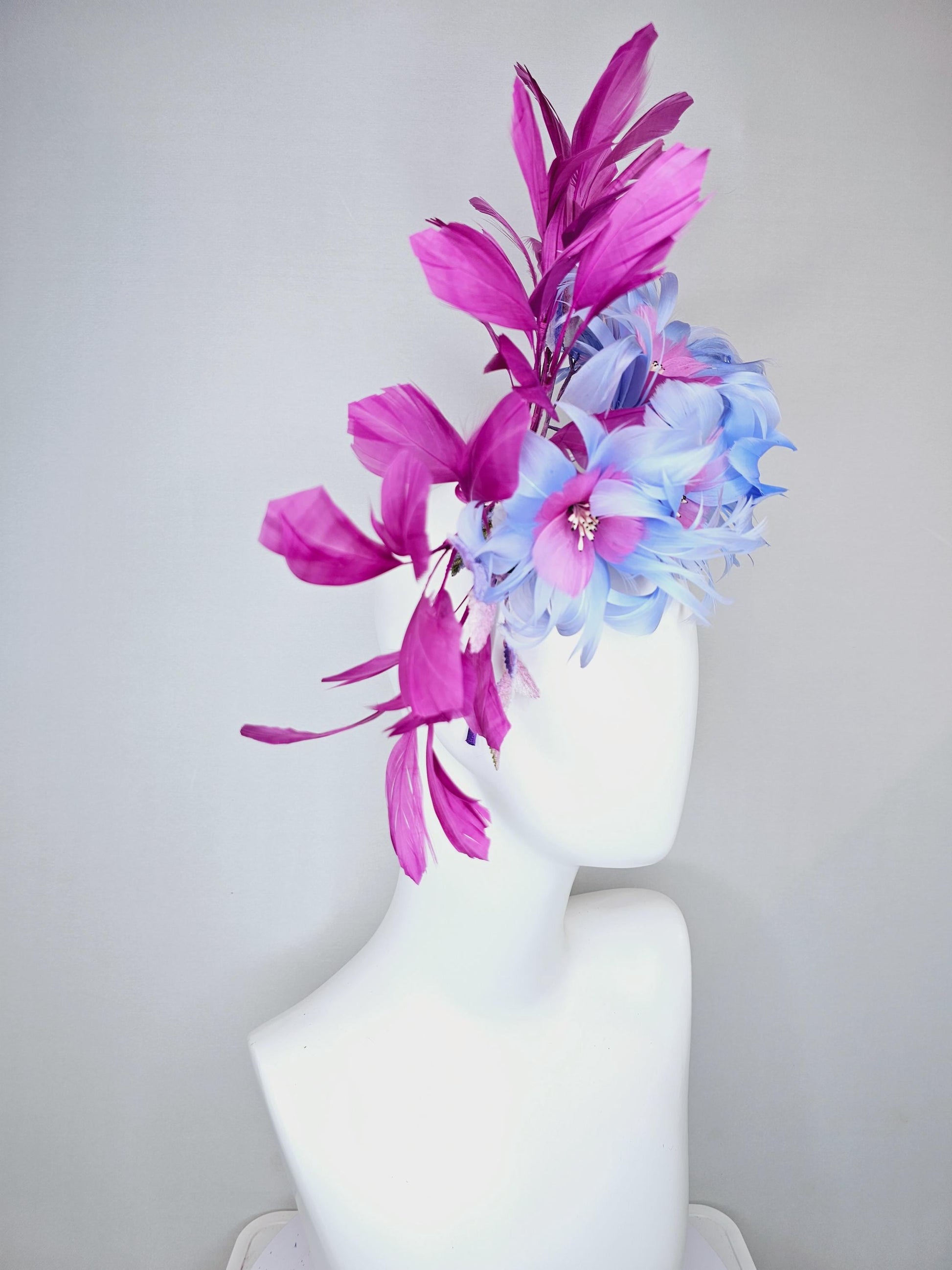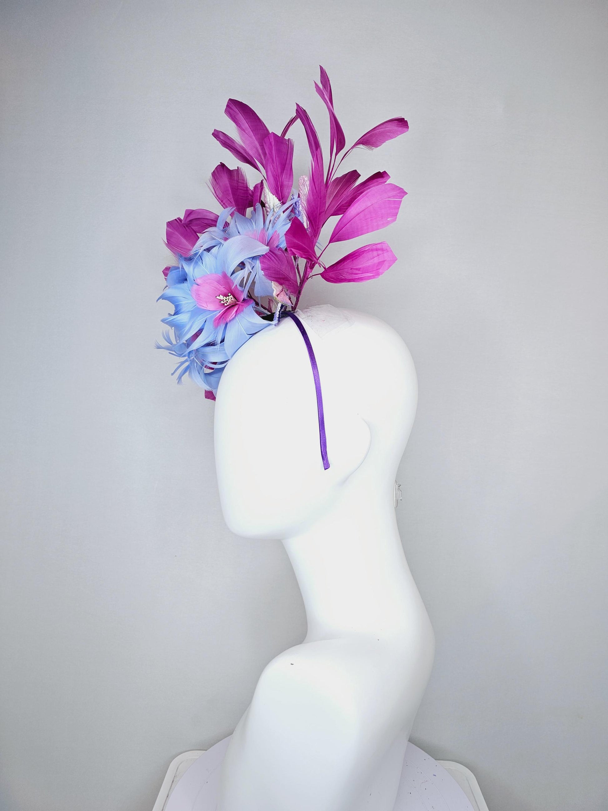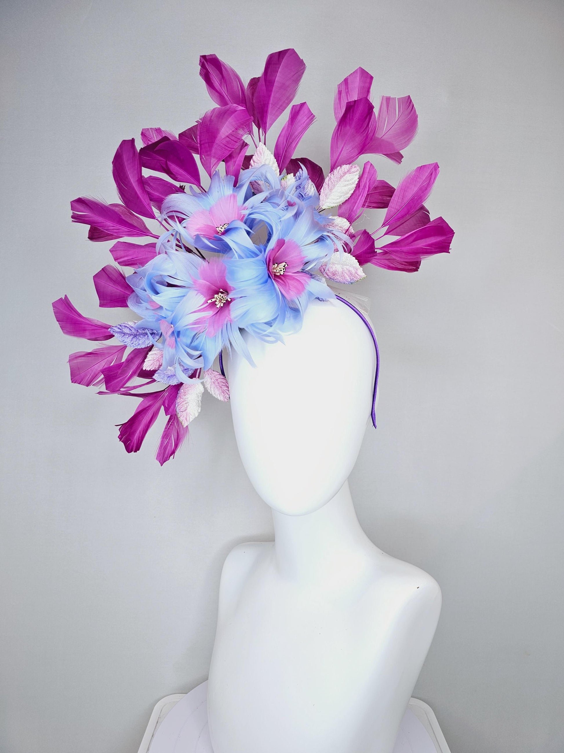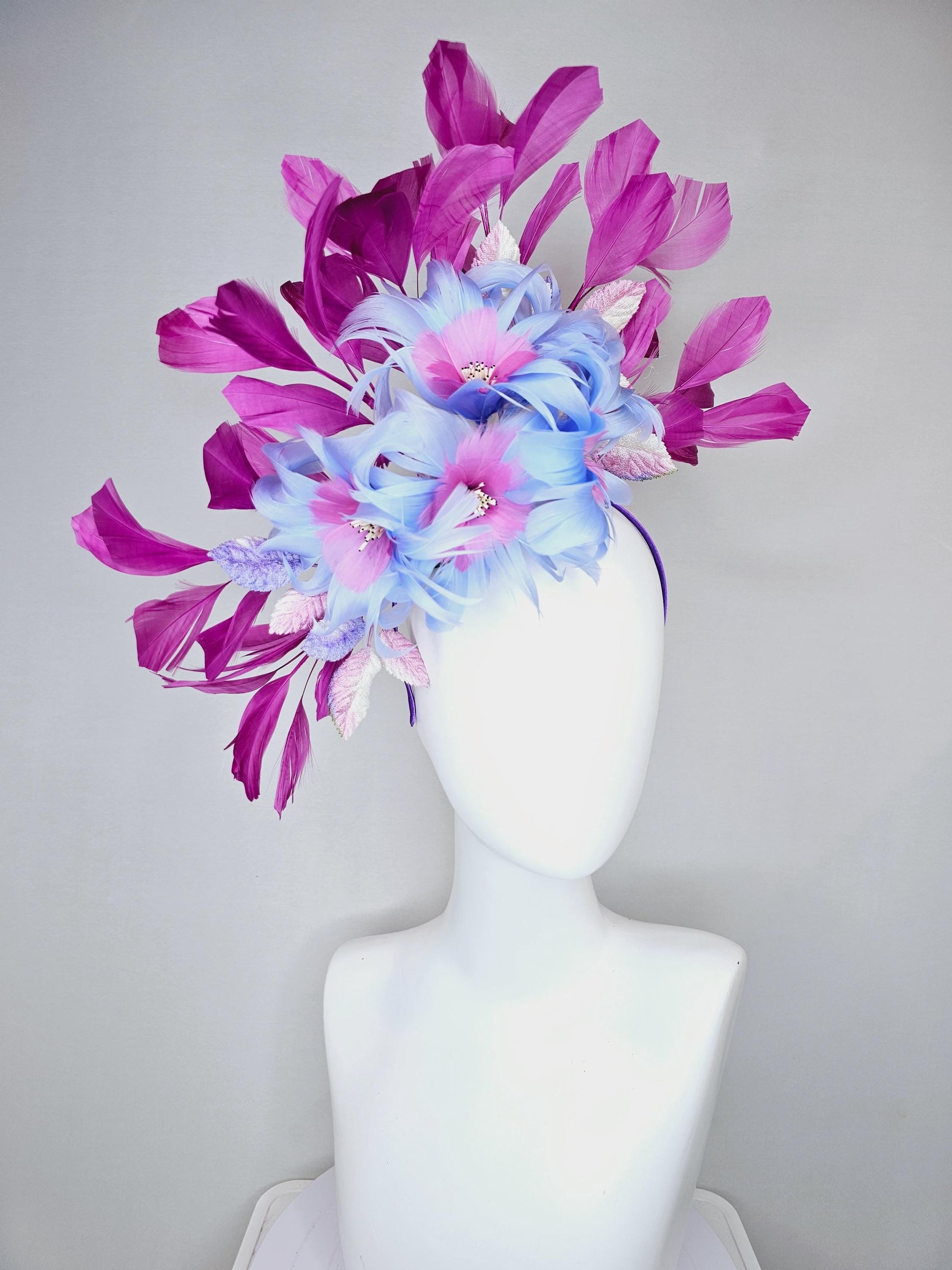 kentucky derby hat fascinator blue and pink feather flowers with ombre pink leaves and magenta purple branching feathers