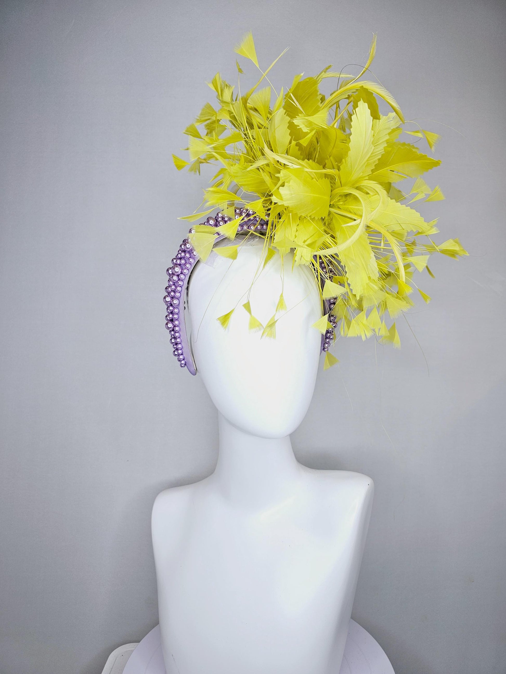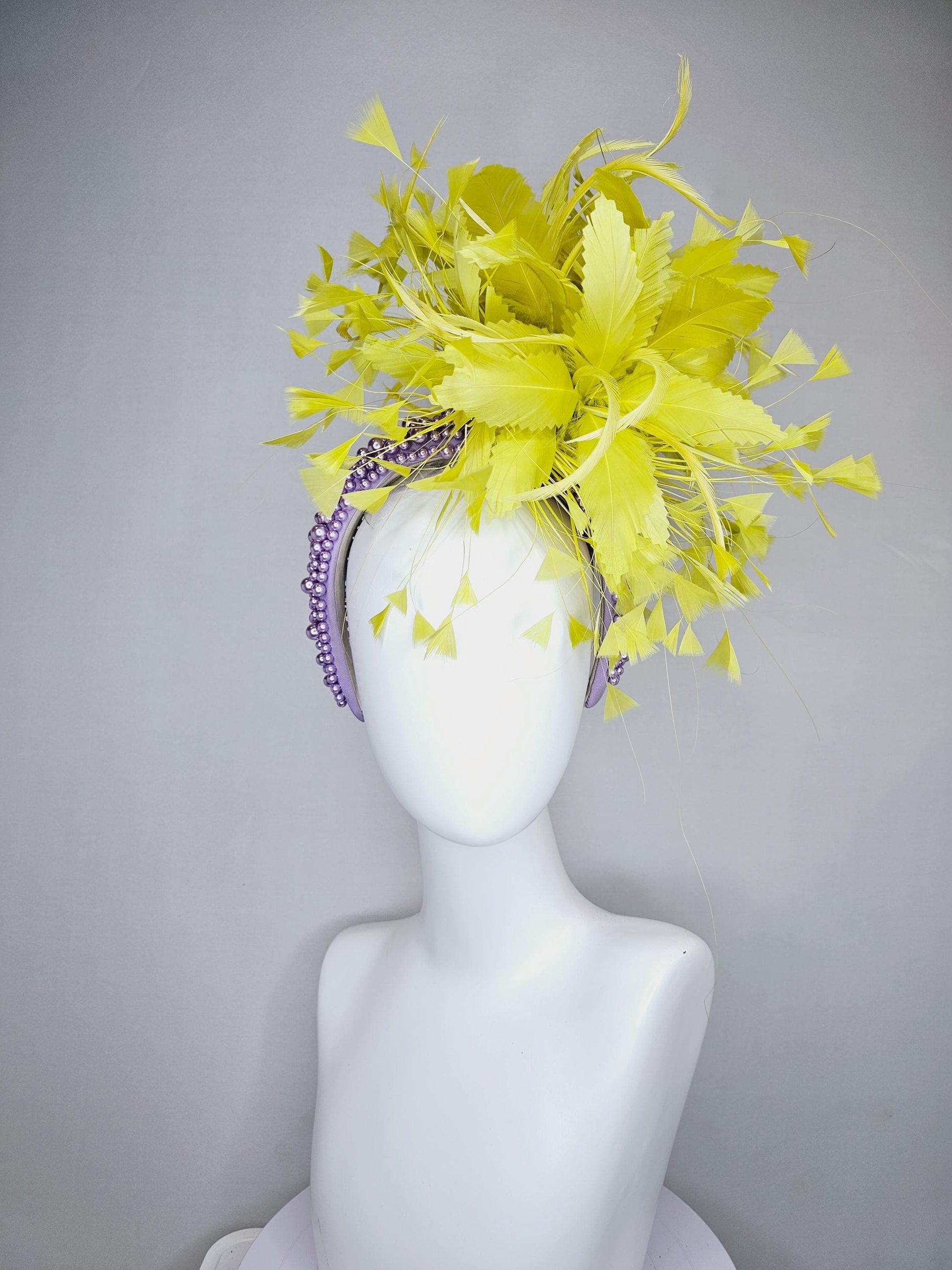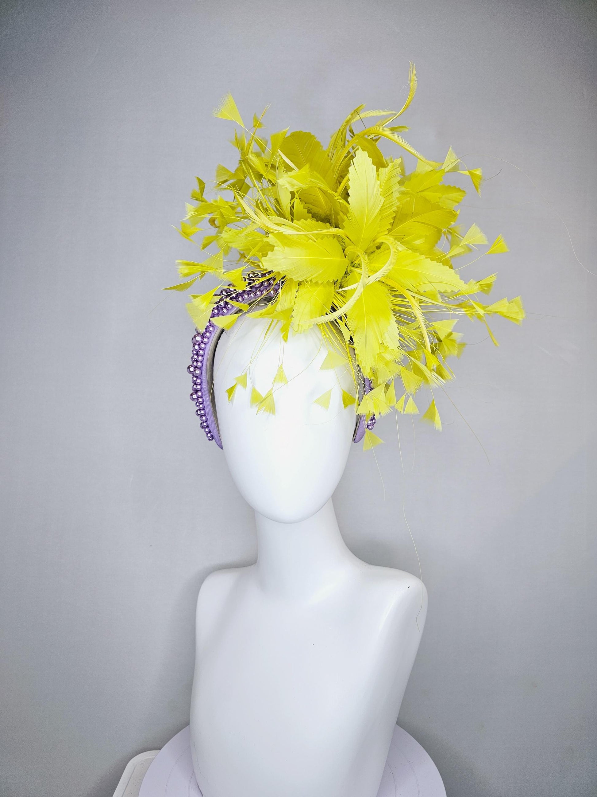 kentucky derby hat fascinator lavender purple pearl beaded headband with bright yellow feather flowers and branching yellow feathers