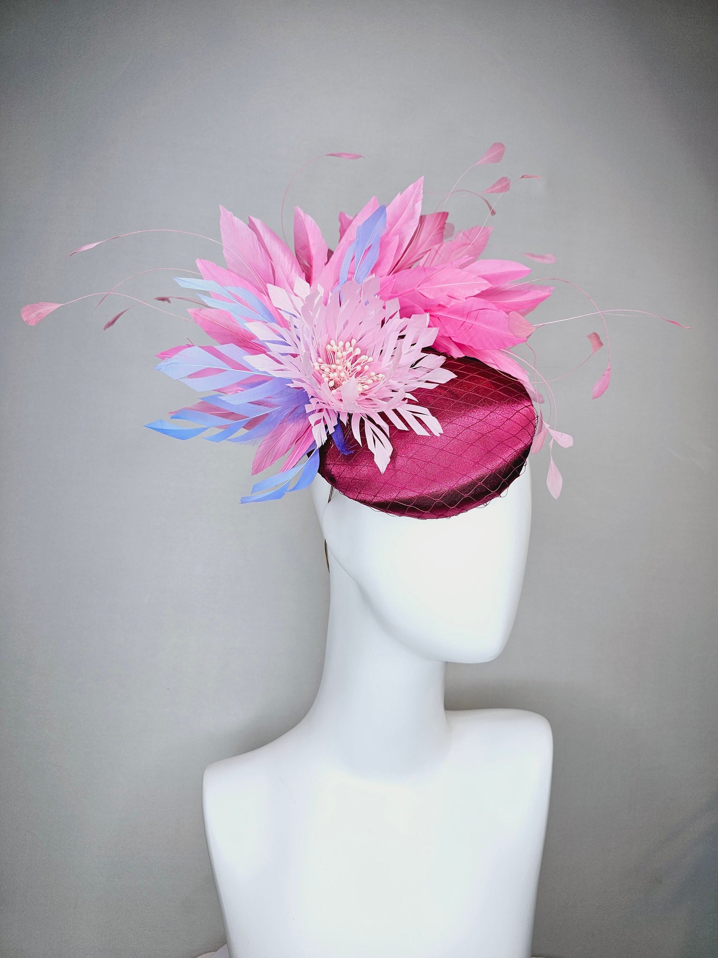 kentucky derby hat fascinator magenta purple pink fuchsia satin with pink feathers lavender pink blue feather flower
