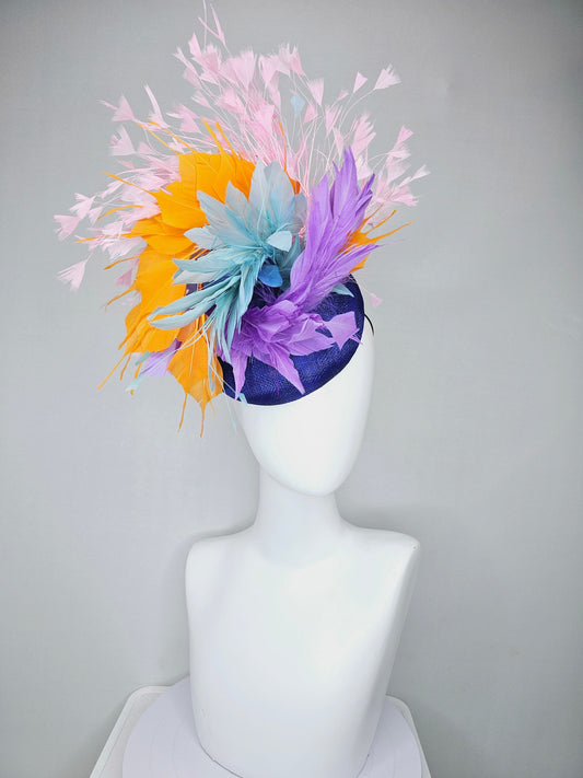 kentucky derby hat fascinator royal blue sinamay with violet purple, teal blue, apricot orange yellow, and baby pink branching feathers