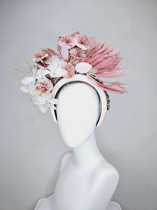 kentucky derby hat fascinator crystal rhinestone jewel beaded headband with blush pink feathers,white wire mesh flowers, light pink feathers