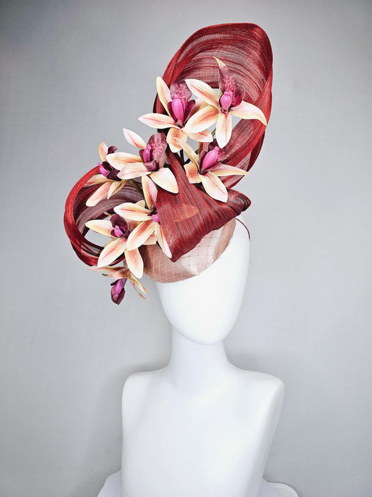 kentucky derby hat fascinator light pink satin with netting,light yellow pink orchid flowers,maroon copper silk ribbon large bendable decor
