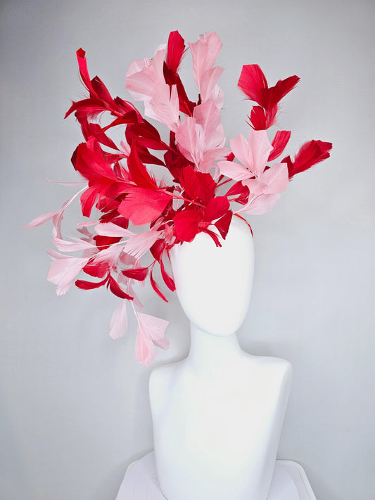 kentucky derby hat fascinator large cherry red and light blush pink branching feathers